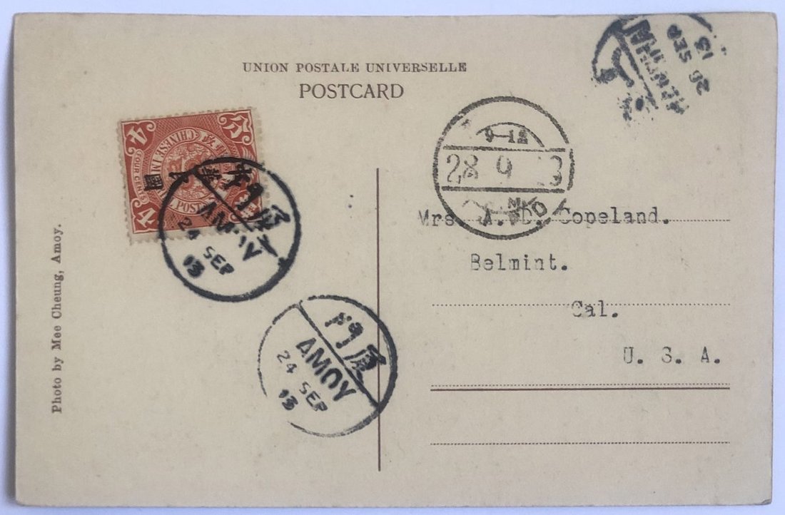 1913 (24 Sep.) Amoy picture postcard to U.S.A. bearing CIP overprinted 4c. tied by Amoy c.d.s., via Shanghai (28.9) c.d.s., very fine.
