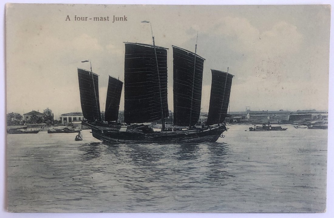 1913年廈門寄美國明信片1件,貼倫敦版蟠龍加蓋楷體中華民國1枚,銷廈門9月24日小圓戳,經上海中轉,有上海26日小圓戳,上海日本客郵局28日戳,明信片背廈門碼頭及帆船圖案,保存完好