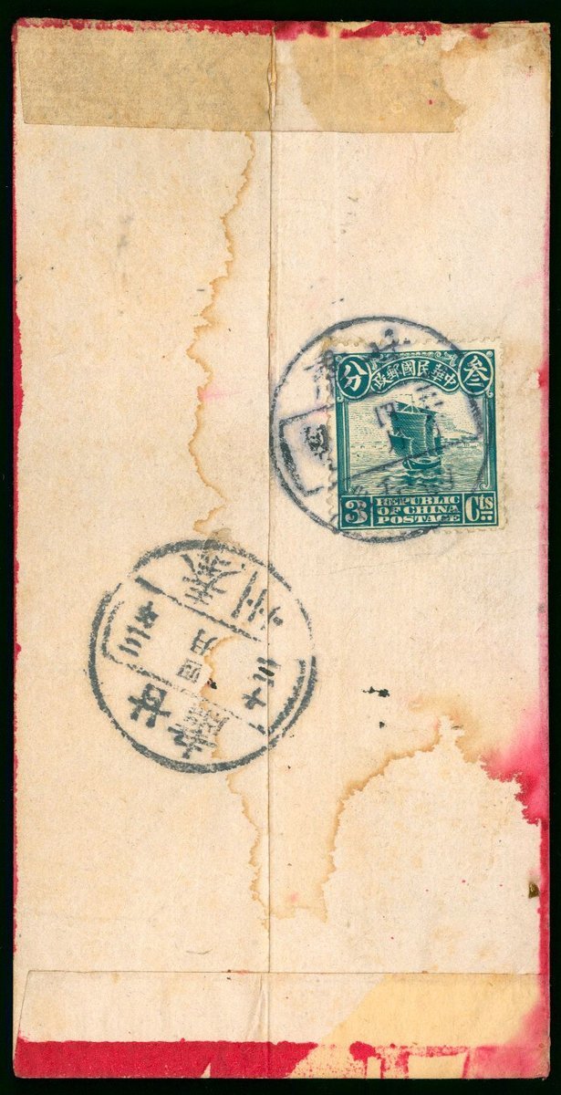 1914 (5 Apr.) decorative native envelope bearing Junk 3c. to Tsinchow, Kansu tied by Sihohsien c.d.s., Tsinchow (13.4) arrival c.d.s., cover has water stain.