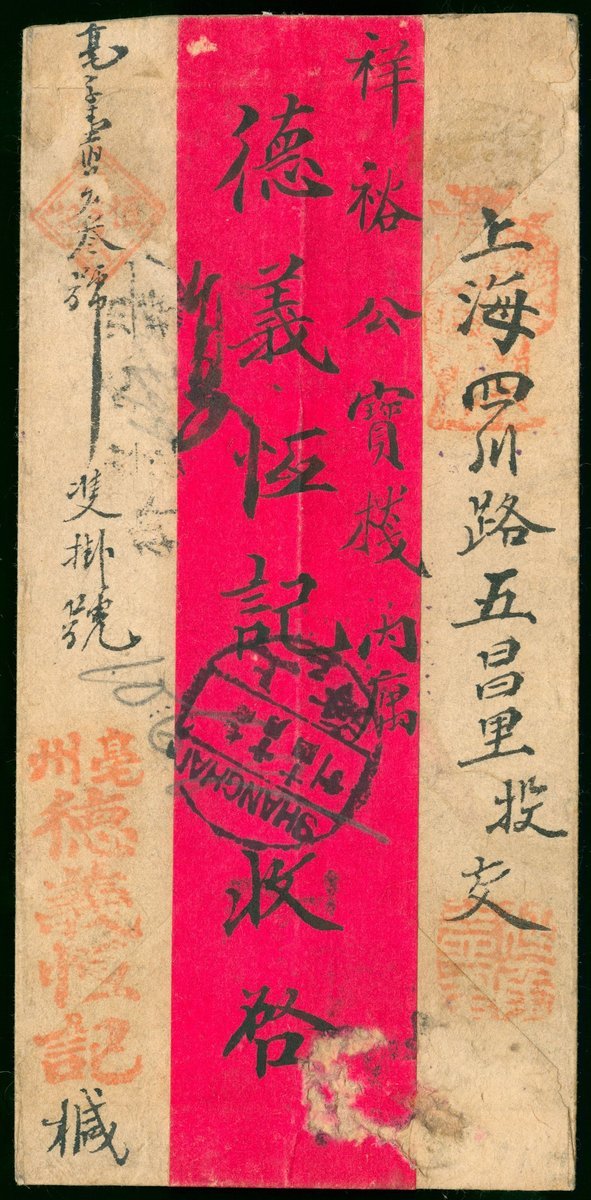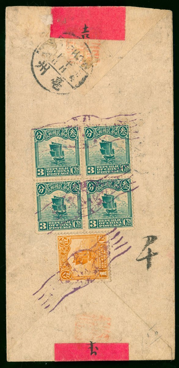 1918 (10 Oct.) a double registered red band envelope to Shanghai bearing Junk 1c. and 3c. block of four tied by National Day commemorative cancellation, alongside with Pochow bilingual c.d.s., on address side with Pochow registered handstamp, Shanghai (14.10) arrival c.d.s.