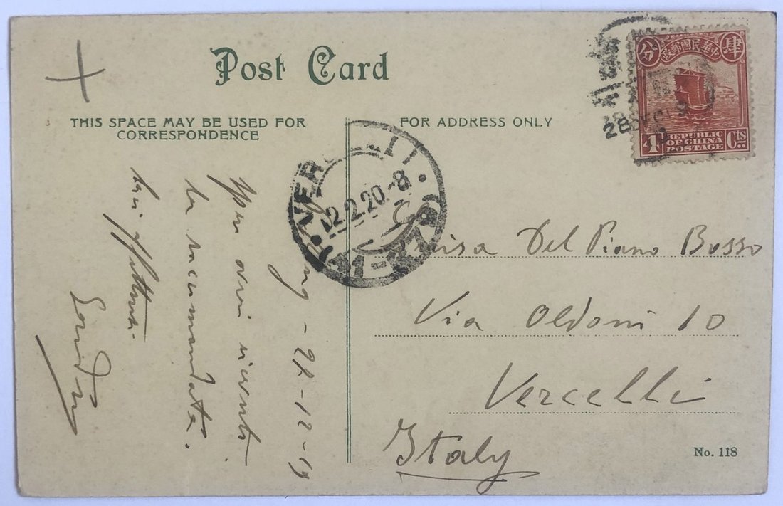 1919 (28 Dec.) Peking picture postcard to Italy bearing Junk 4c. tied by Peking bilingual c.d.s., Italy (12.2) arrival c.d.s., very fine.