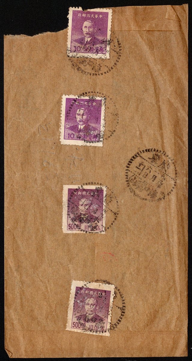 1950年海口寄香港實寄封1件,貼華南版孫像銀元10分4枚,銷廣東海口瓊山三十九年一月六日戳,保存完好,海南民國三十九年郵戳少見