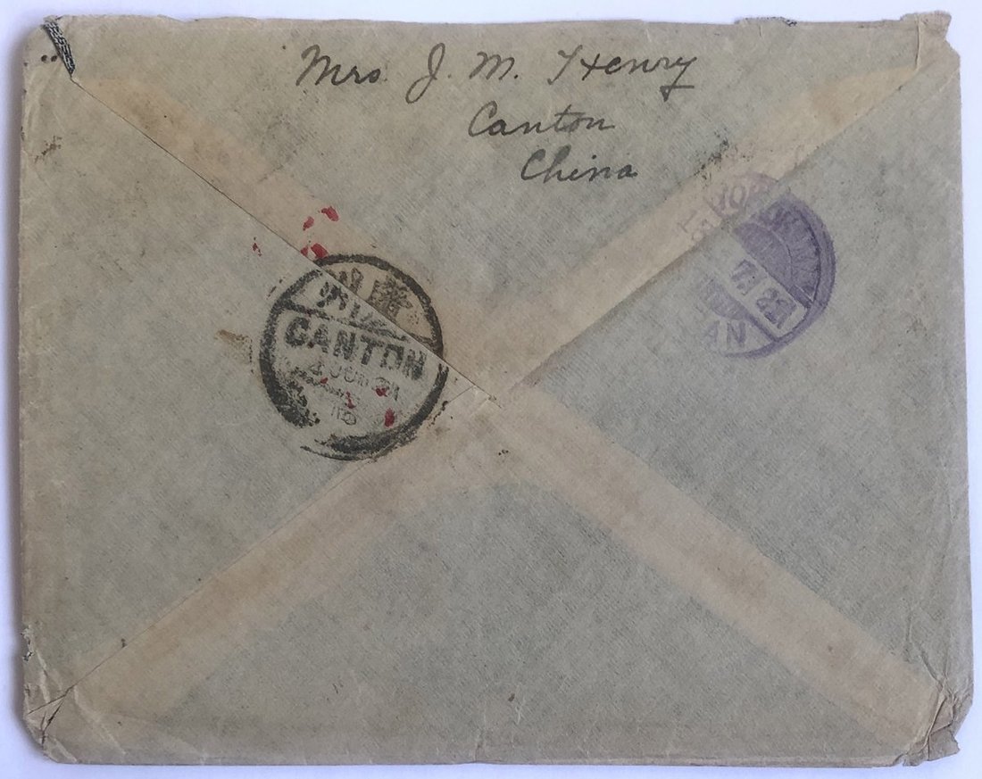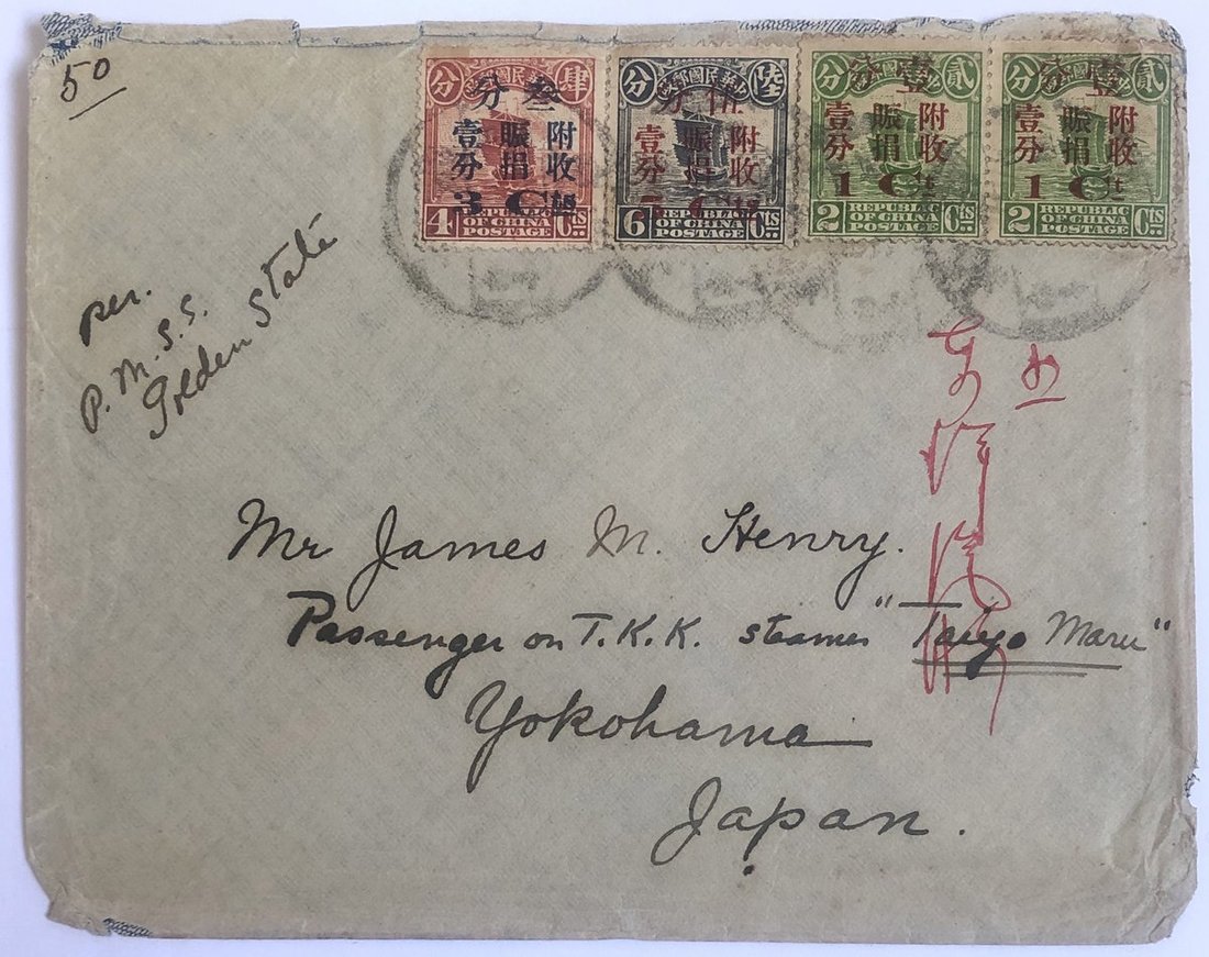 1921 (4 Jul.) envelope to Passenger on steamer in Yokohama, Japan bearing Famine Relief Fund surcharged set of three and 1c. tied by Canton c.d.s., Japan (13.7) arrival c.d.s., interesting cover.
