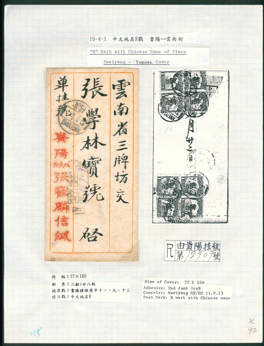 1922年貴陽寄雲南中式掛號封1件,貼北京一版帆船1分8枚,銷貴陽9月13日英漢腰框戳,另蓋由貴陽掛號長框戳,置於研究貼片之上,保存完好,為張凱升先生《中國郵戳史》之原件