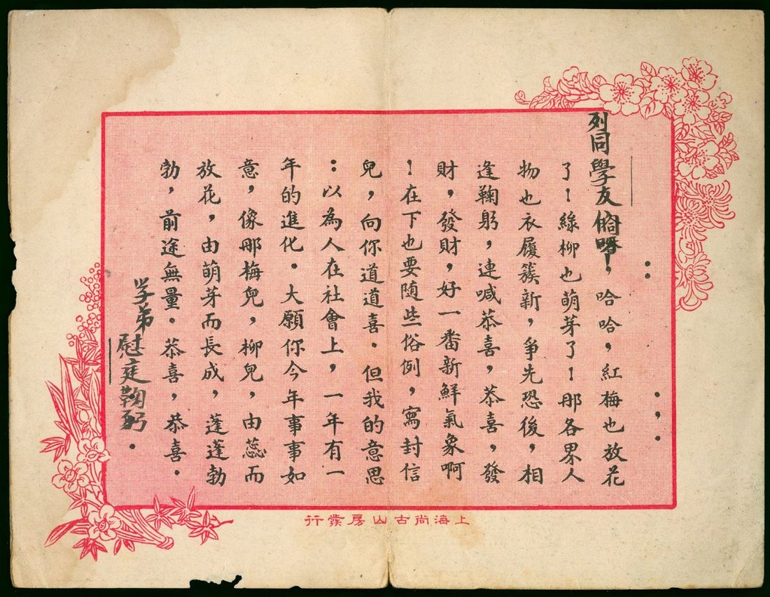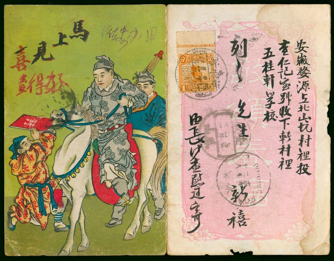 1923年長沙寄安徽婺源美術賀年摺子1件,貼北京二版帆船1分(帶上英文廠銘邊紙),銷長沙府2月腰框戳,經休寧,鳳山中轉,有休寧2月18日英漢腰框戳,安徽鳳山2月21日中文腰框戳,摺子由上海尚古山房發行,印有寓意“馬上見喜”之吉祥畫,印刷精美,保存完好,少見
