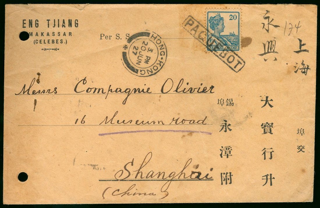 1927 (20 Jun.) incoming paquebot cover from Celebes, Indonesia to Shanghai bearing Nederi-Indie 20c. cancelled by boxed "PAQUEBOT" with Hong Kong (20.6) c.d.s. adjacent, on reserve with Shanghai (23.6) arrival c.d.s., cover left with two filing holes.