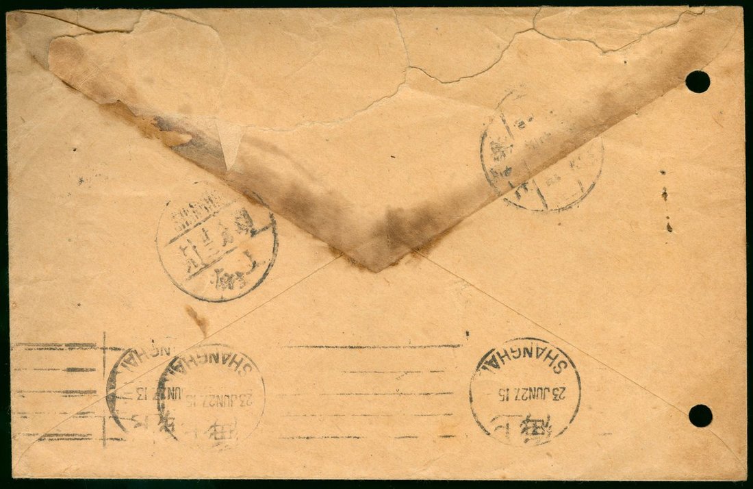 1927年荷屬印度寄上海永興大寶行僑批封1件,貼荷屬印度20分1枚,經香港輪船郵局寄送,郵票銷香港輪船郵局PAQUEBOT戳,另銷香港6月20日戳,有上海23日機蓋中轉戳,及上海同日到達戳,保存完好,寄上海僑批極少見
