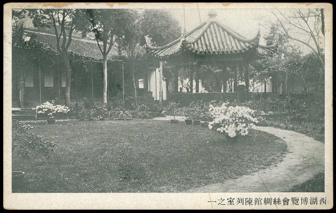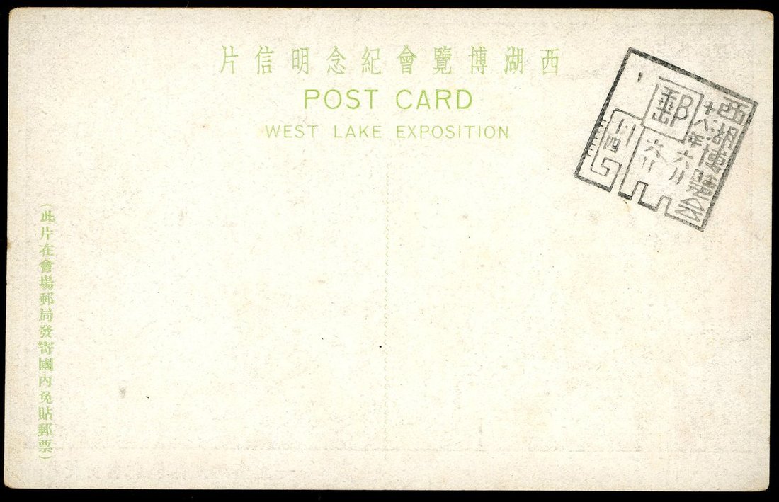 1929年杭州西湖博覽會兔資片1件,片背圖為黑色絲綢館陳列室之一,正面銷西湖博覽會6月6日(首日)臨時郵戳,未經實寄,保存完好。