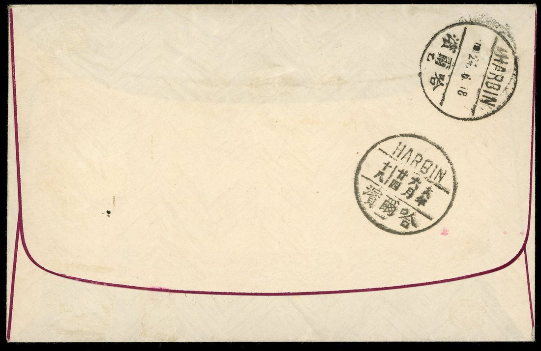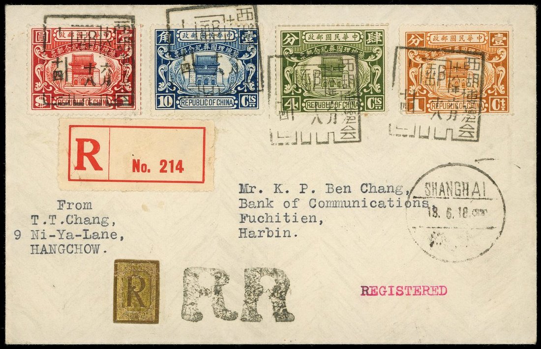 1929 (18 June) a registrated envelope to Harbin bearing State Burial set of four tied by West Lake Expo. commemorative cancellation, showing registered label and unframed "R R" in black, Harbin (24.6) arrival c.d.s.
