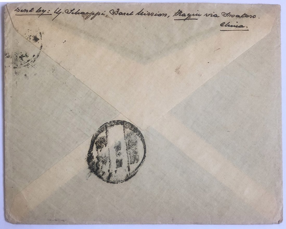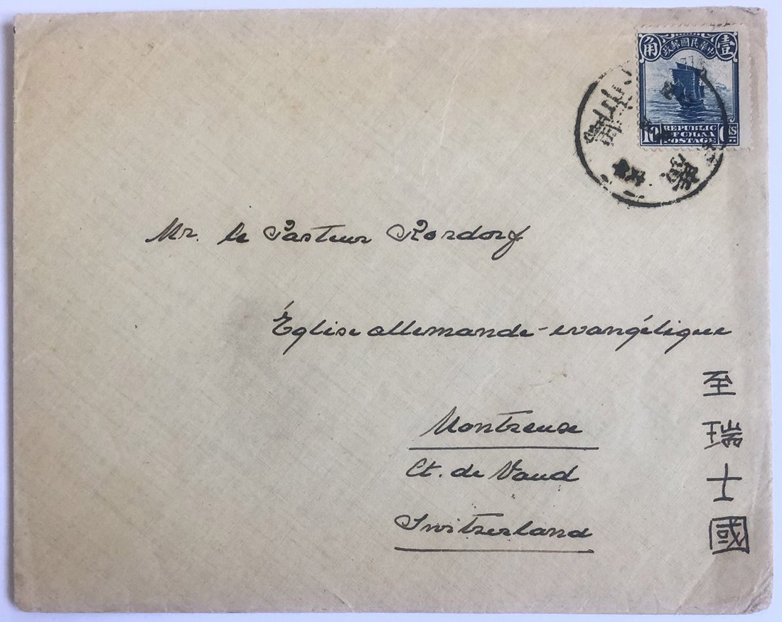 1929 (24 Sep.) envelope to Switzerland bearing Junk 10c. tied by Hokshiha c.d.s. via Laolung on reverse.