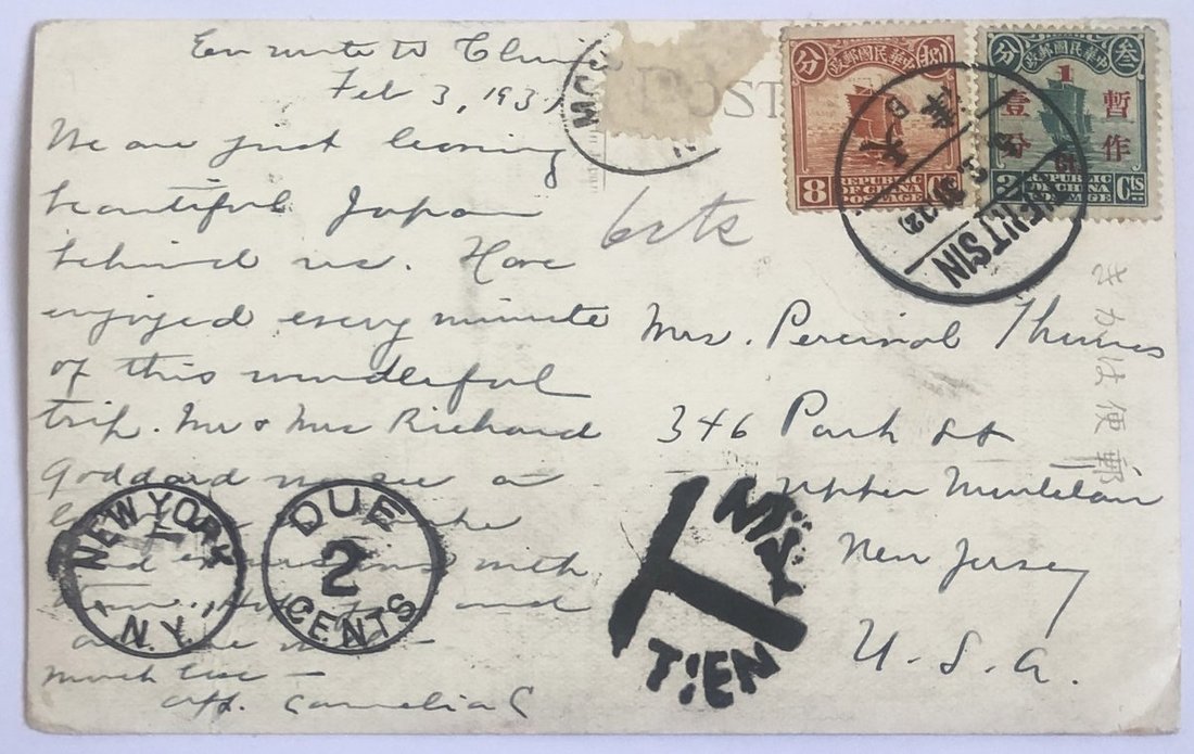 1931年天津寄美國明信片1件,貼北京一版帆船8分1枚,帆船加蓋暫作壹分1枚,合資9分,銷天津2月5日戳,國際明信片郵資已於2月1日改為12分,因此作欠資處理,蓋天津T戳,到美國另蓋美國紐約欠資戳,保存完好