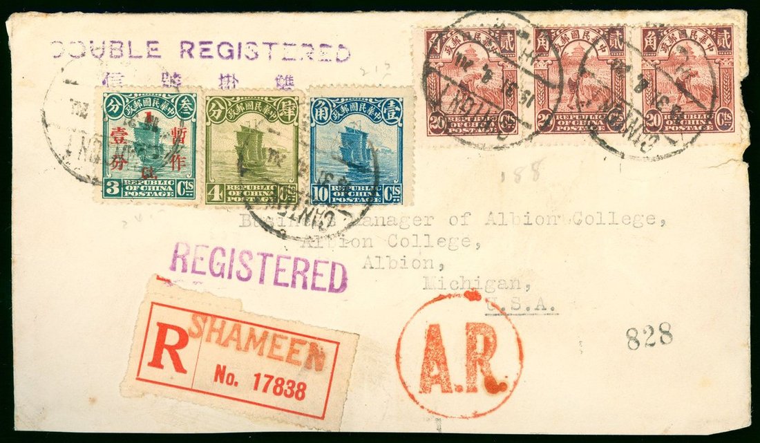1931 (20 Aug.) double registered envelope to U.S.A. bearing Junk 1c. on 3c., 4c., 10c. and 20c. (3) tied by Canton c.d.s., showing circle "A.R." handstamp in red and "SHAMEEN" registered label, half of cover back missing, on reverse Albion (26.9) arrival c.d.s.