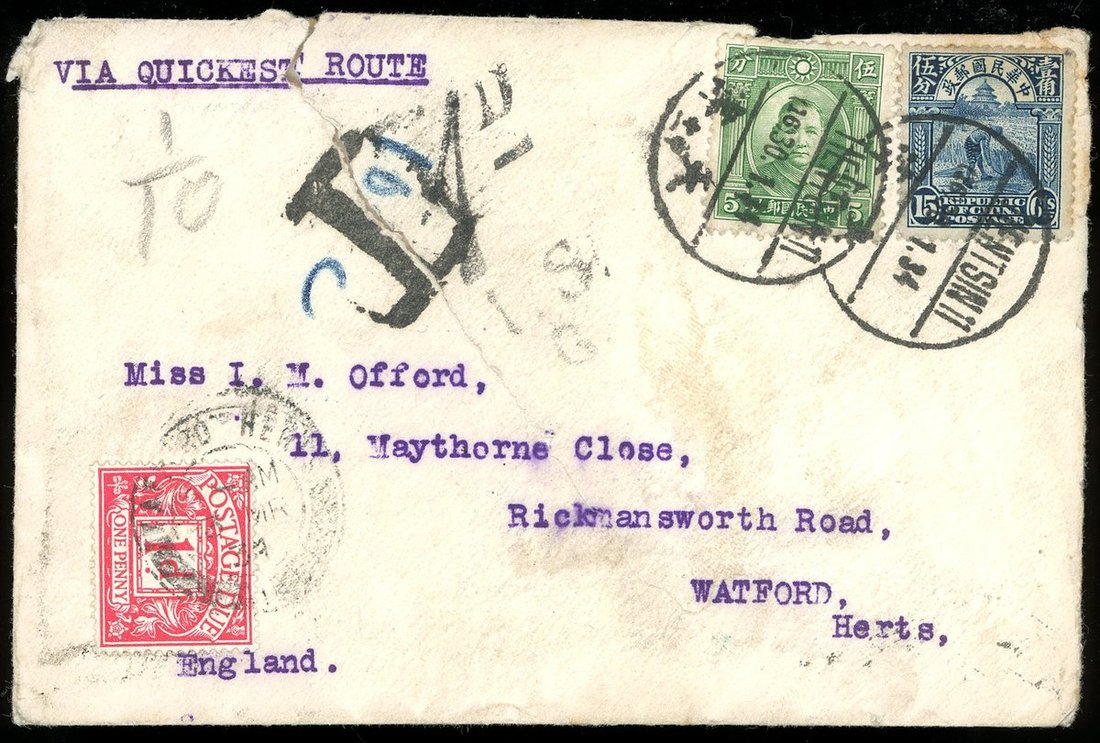 1934年天津寄英國實寄封1件,貼北京二版農獲15分1枚,倫敦一版孫像5分1枚,銷天津1月30日戳,郵件因郵資不足,做欠資處理,蓋T戳,到英國後另貼英國欠資票1便士1枚,銷英國3月3日戳,保存完整