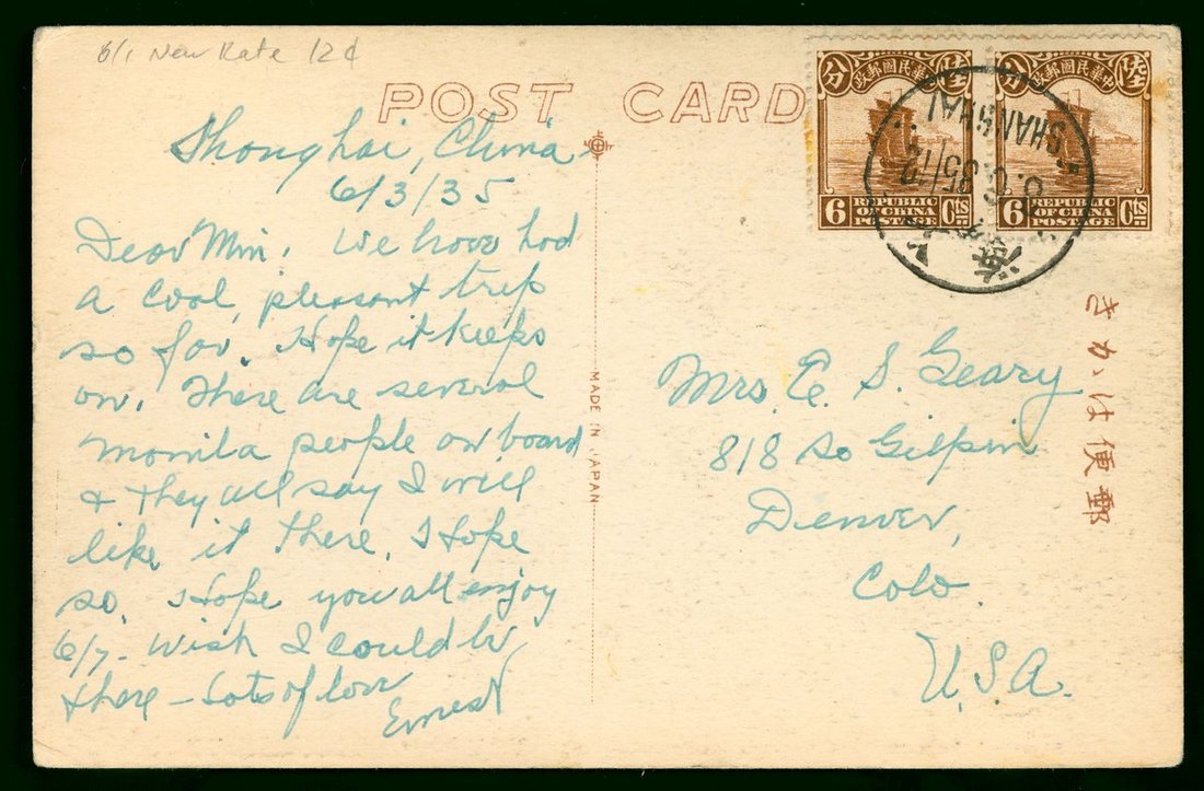 1935 (3 Jun.) A picture postcard to U.S.A. bearing 6c. brown pair tied by Shanghai c.d.s., 12c. postcard rate from 1st June, early usage.