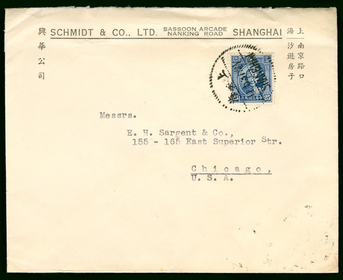 1937年上海興華公司寄美國公函封1件,貼倫敦一版孫像25分1枚,銷上海5月11日戳,封背印有萊卡照相機圖案廣告,保存完好,少見