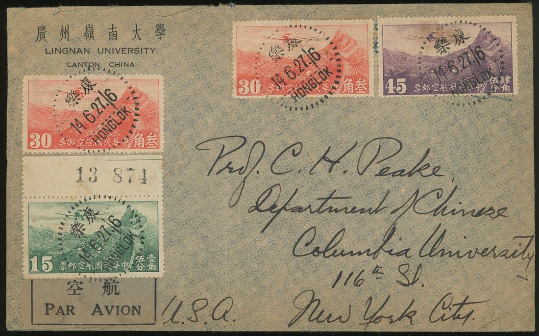 1937-38年廣州嶺南大學寄美國公函封2件,包括貼京三版航空郵票30分2枚,15分及45分各一枚,銷康樂6月14日戳,有廣州同日中轉戳;以及37年4月27日中美航線掛號首航封1件,均保存完好