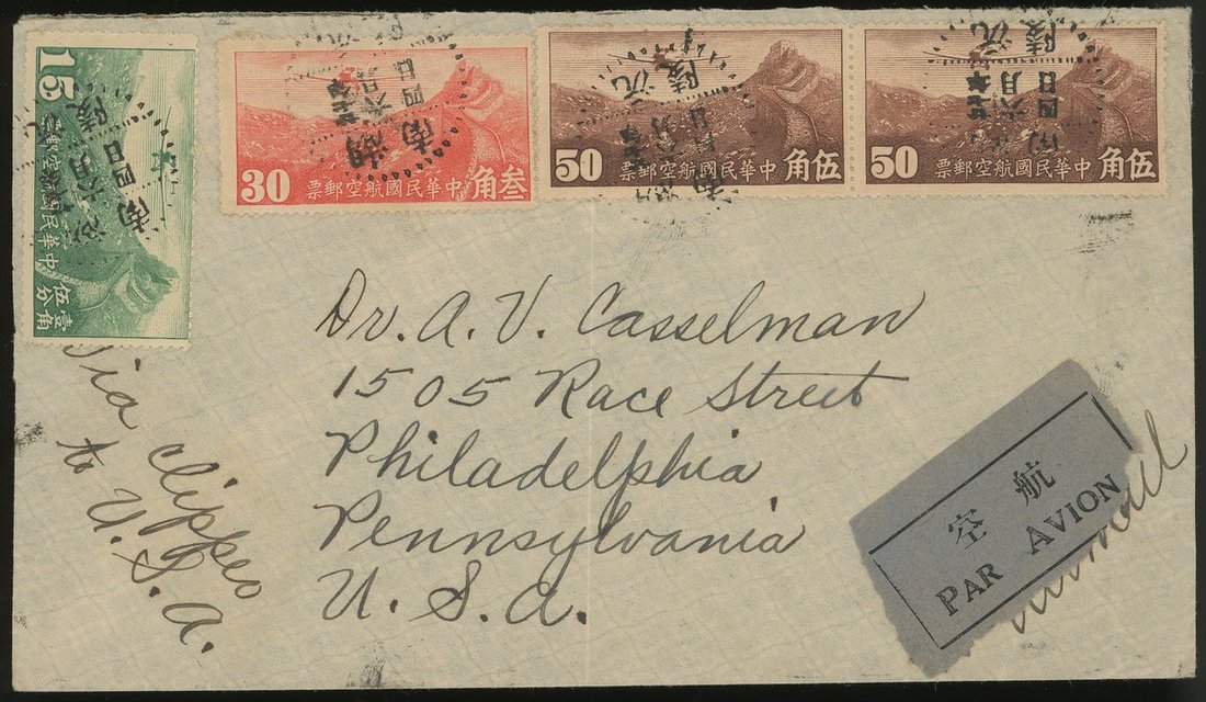 1938年湖南沅陵寄美國航空封1件,手寫郵路指示經飛剪號,貼北京三版航空15分30分各一枚,50分2枚,銷湖南沅陵6月4日戳,有香港6月9日中轉戳,保存完好