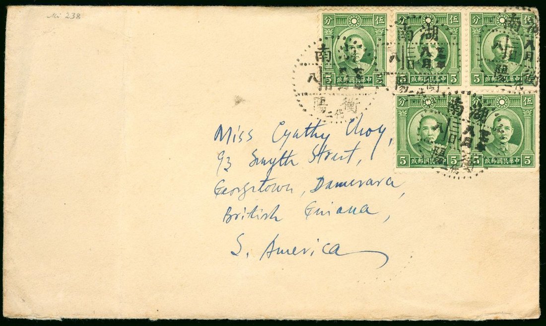 1938年8月3日寄英屬圭亞那封, 貼孫像伍分票五枚, 銷湖南衡陽雙語日戳, 封背蓋廣州8月6日中戳, 另蓋有同日期機印戳. 目的地少見.