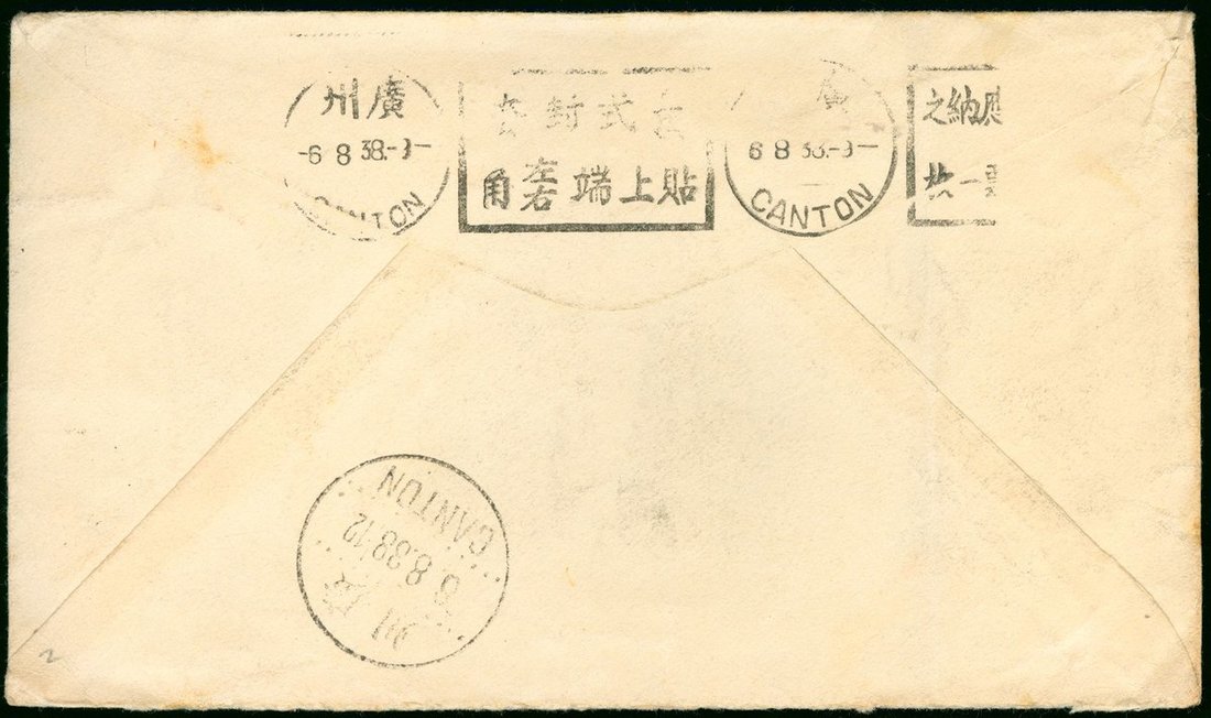 1938 (3 Aug.) envelope to British Guiana bearing SYS 5c. (5) tied by Hengyang c.d.s., on reverse showing Canton (6.8) meter cancelled and c.d.s., scarce destination.
