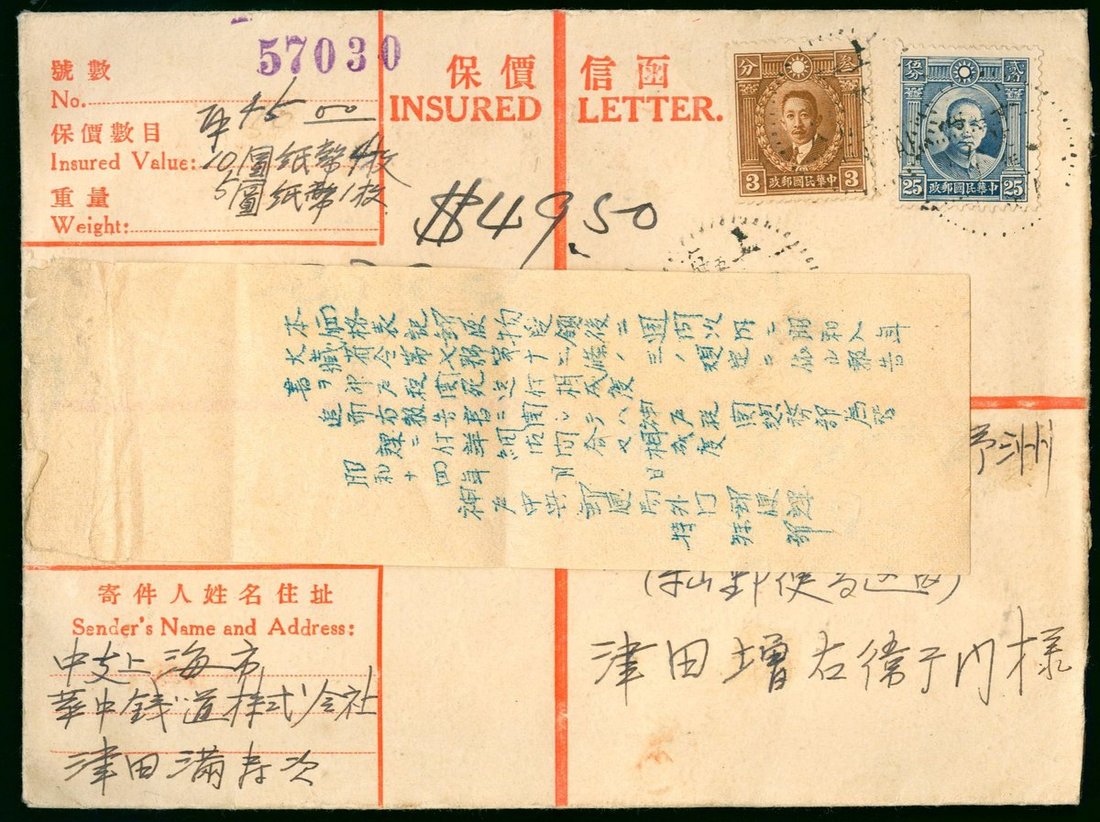 1939年上海寄日本中華郵政西式保險信函專用封1件,貼倫敦版孫像25分1枚,京版烈士3分1枚,銷上海8月18日戳,封口處蓋有火漆,郵件到日本後中央郵便局外口郵便特殊部貼批條1張,保存完好,少見