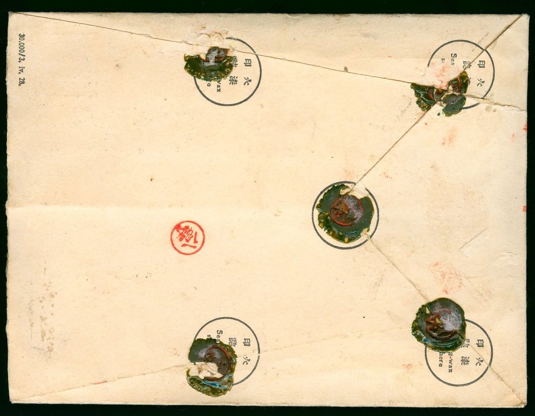 1939 (18 Aug.) insured letter envelope to Japan bearing Martyrs 3c. and SYS 25c. tied by Shanghai c.d.s., on reverse with wax seals, scarce.