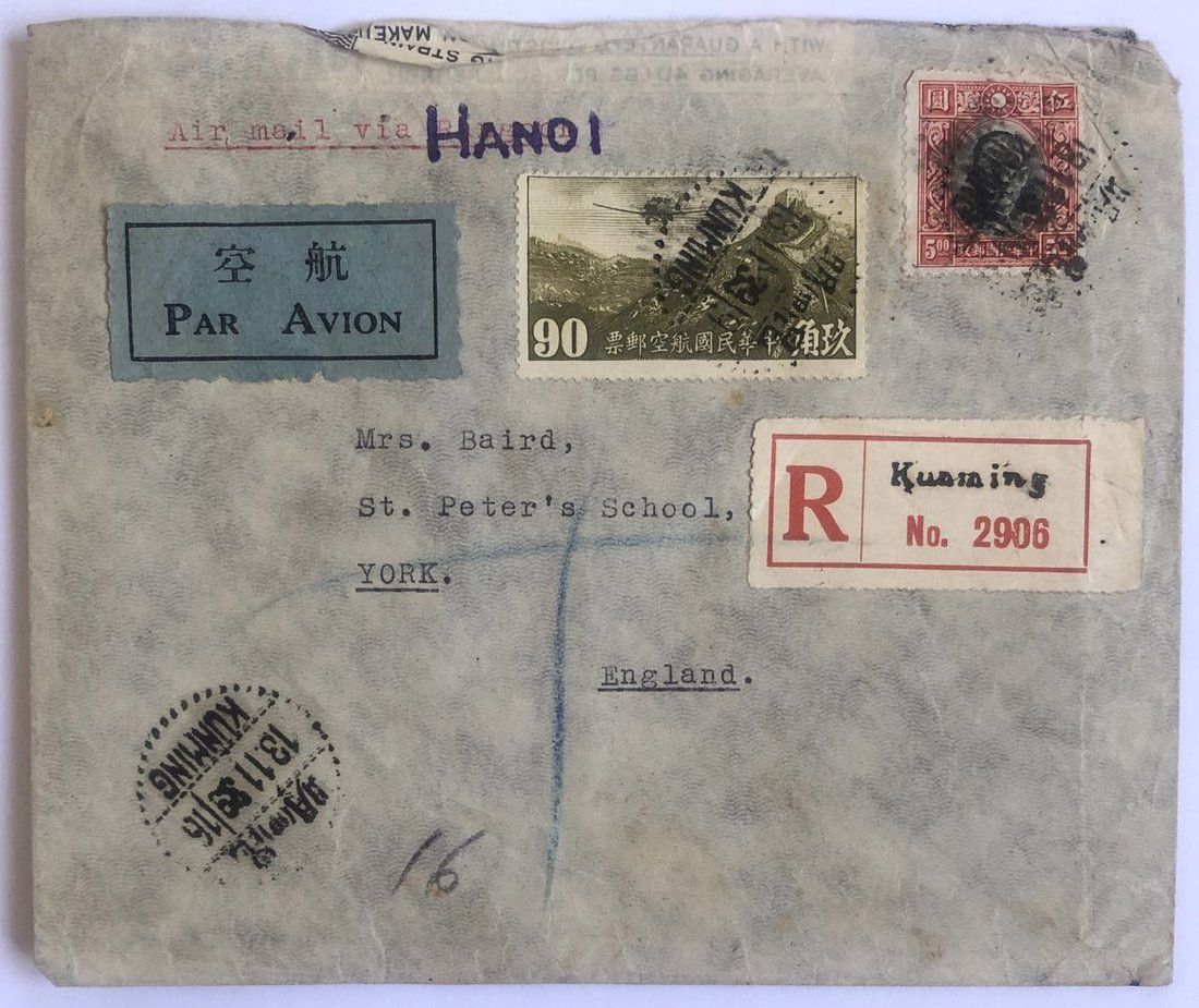 1939年昆明寄英國航掛封1件,信封左上角打字郵路指示航空經仰光,後用河內地名郵路指示戳覆蓋,貼香港中華版孫像5元,北京三版航空90分各一枚,銷昆明11月13日戳,郵戳清晰,保存完好