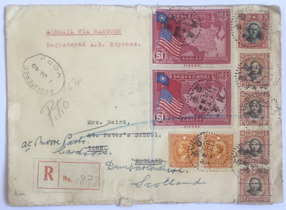 1939 (16 Dec.) air mail double registered express envelope to England redirected to Scotland bearing Martyrs 40c., Constitution of the U.S.A. $1 pair, Dr. SYS $1 (4) and $5, all Dr. SYS stamps with Anti-Bandit (Chungking) chops, tied by Chungking c.d.s., via Hong Kong (19.12) and York (1.1) registered c.d.s.