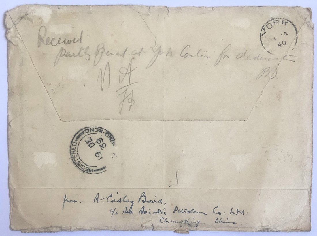 1939年重慶寄蘇格蘭航空快信雙掛號實寄封1件,左上角紅色大字航空經仰光郵路指示,貼美慶1元直雙連,京版烈士40分橫雙聯,倫敦一版孫像1元重慶防盜加蓋直四連,香港中華版5元重慶防盜加蓋1枚,合資11.8元,符合31-40克國際航空快信雙掛號郵資,銷重慶12月16日戳,經香港中轉有香港12月19日戳,另有有英國約克40年1月1日(元旦)掛號郵件專用到達戳,保存完好,抗戰時期國際航空快信雙掛號特殊郵資本身不多,加之貼重慶防盜加蓋郵票更為少見,絕佳抗戰郵政史郵集素材