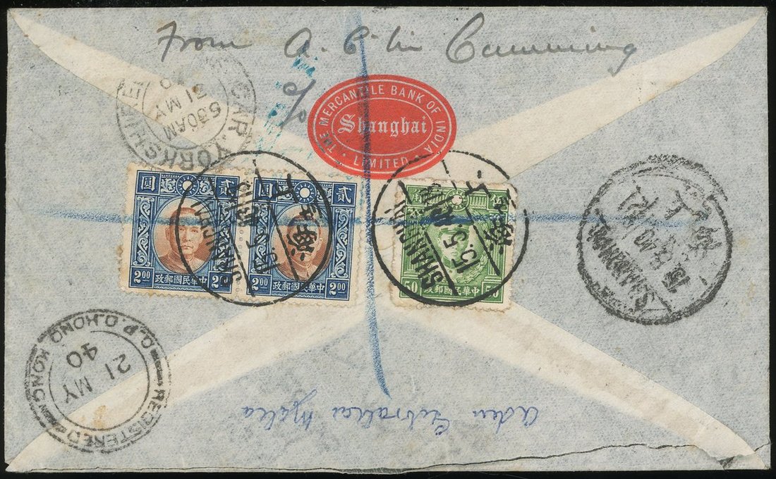 1940 (15 May) to England registered air mail cover, on the reverse, bearing Dr. Sun $2 (2) and 50c. tied by Shanghai c.d.s., with Hong Kong transit s.d.s.and England arrival c.d.s. (31.5), also with Hong Kong censor seal on address side.