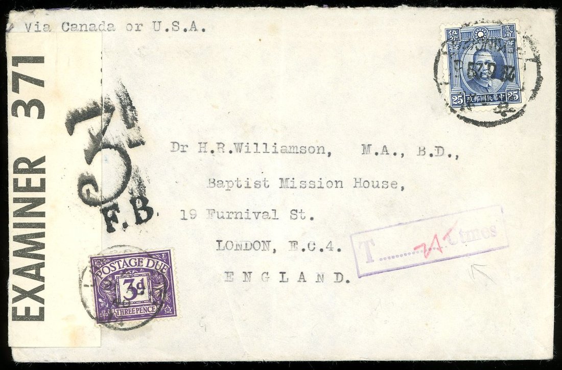 1940 (29 June) via U.S.A. to England cover, bearing London 1st print Dr.Sun 25c. tied by Peking c.d.s., with Postage due seal alongside, arrival England with examiner seal, and paid 3d postage due. Fine.