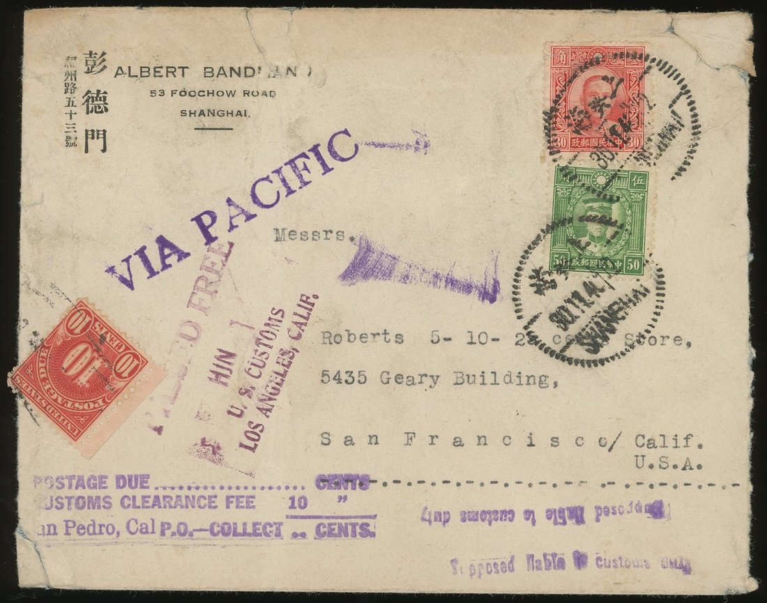 1940年上海寄美國三藩市實寄封1件,蓋經太平洋郵路指示戳,貼港版孫像30分1枚,港版烈士50分1枚,銷上海11月30日戳,到美國補納關稅,貼美國欠資票10分1枚,蓋海關欠資戳及放行戳,保存完好,此封郵資沿用前期郵資未作欠資處理