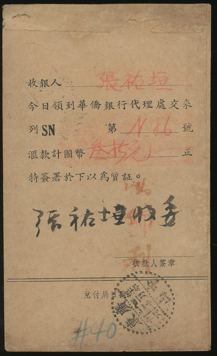 1941 (20 Feb.) to Singapore oversea-Chinese Banking corp., Ltd. "qiao pi" reply cover, on the reverse, tied by Chungshan c.d.s. Fine.