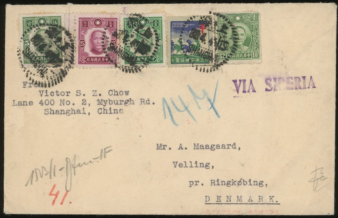 1941年上海寄丹麥實寄封1件,貼港版及紐約版孫像郵票4枚,合資50分,以及上海防癆協會標籤1枚,均騎縫銷上海4月30日戳,經德國軍事檢查,背貼檢查封條並蓋檢查章,保存完好