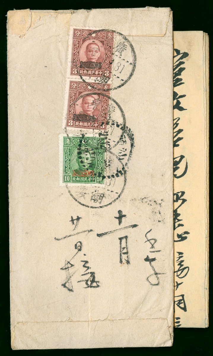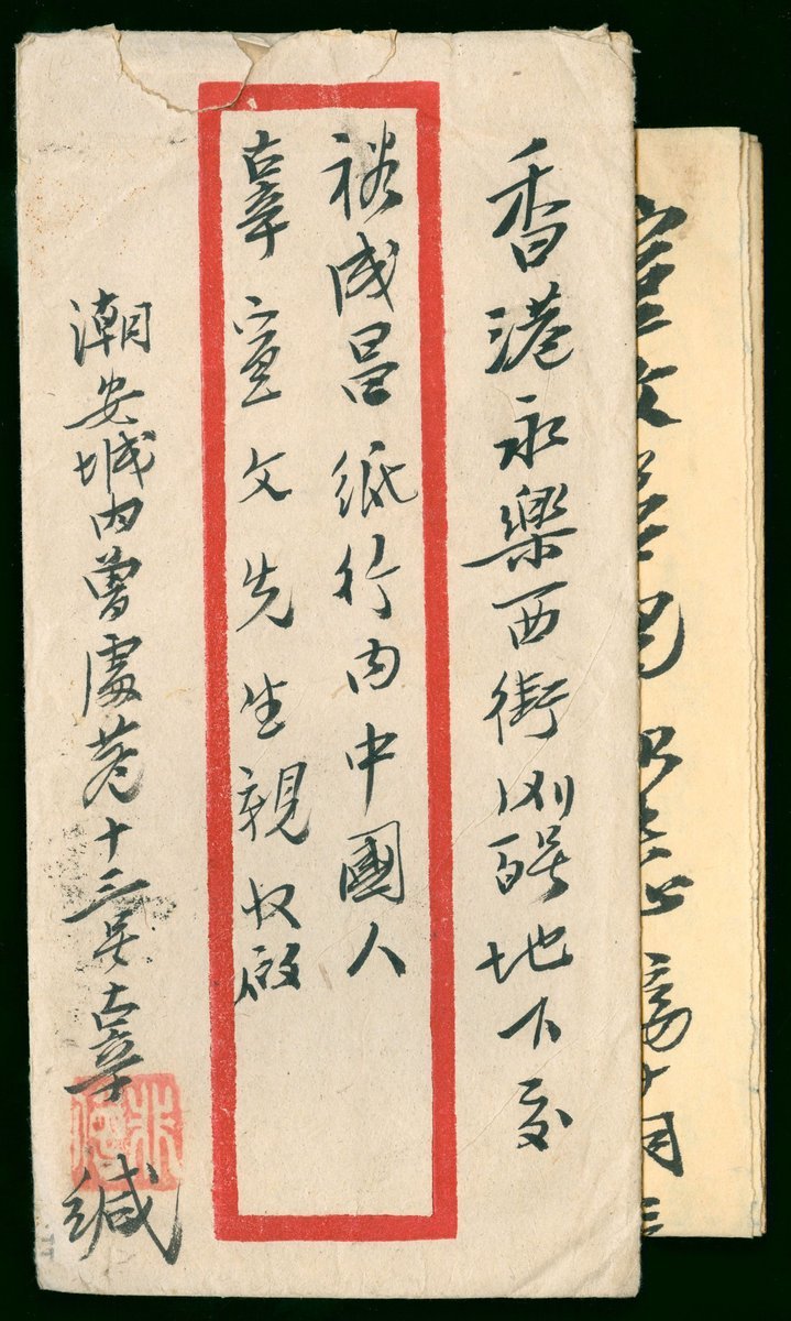 1942年廣東潮安寄香港實寄封1件,貼港版孫像加蓋粵區特用3枚,郵資合計16分,銷廣東潮安12月9日戳,經汕頭中轉有汕頭9日中轉戳,附原僑信,保存完好