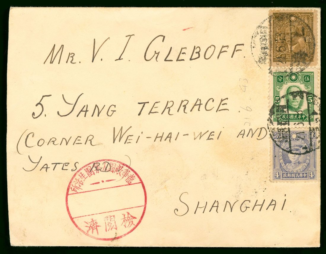 1943年上海寄本埠龍華集中營實寄封1件,貼港版烈士4分,紐約版孫像5分,及中信版孫像16分各一枚,銷上海6月21日戳,另有同日上海到達戳,郵件經集中營檢查,蓋龍華敵國人集團生活所檢閱濟圓形檢查戳,保存完好,中信版16分使用本就極少見,此封又是在淪陷區使用此票,並且為集中營郵件,很可能為目前僅見