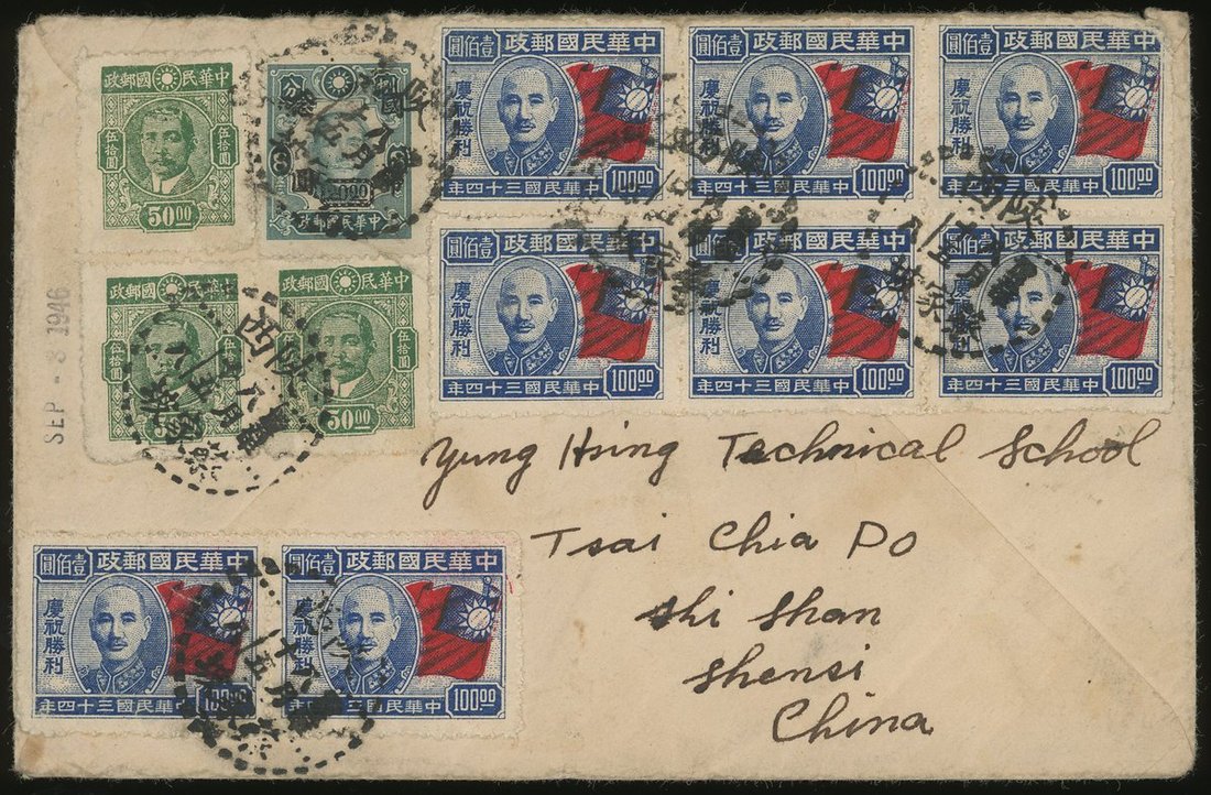 1946年陝西蔡家坡私立雍興高級工業職業學校寄美國航空封1件,貼重慶中央版孫像50元3枚,孫像加蓋國幣20元1枚,抗戰勝利100元8枚(套色移位變體),銷陝西蔡家坡8月15日戳,保存完好