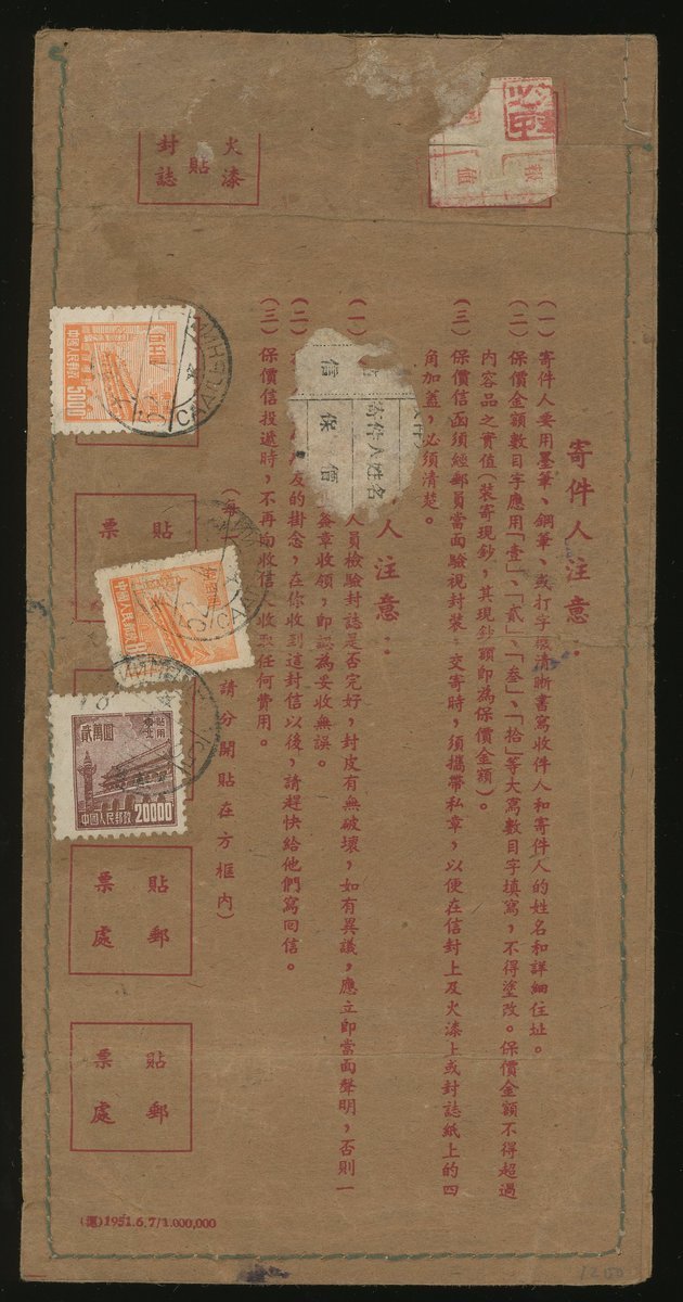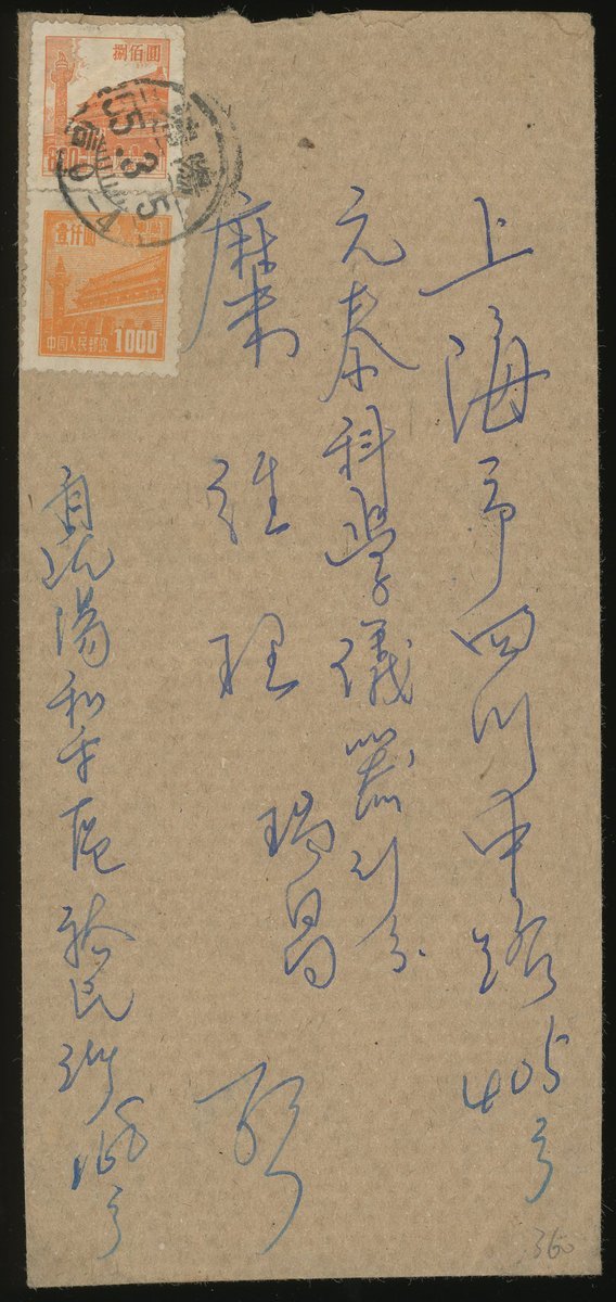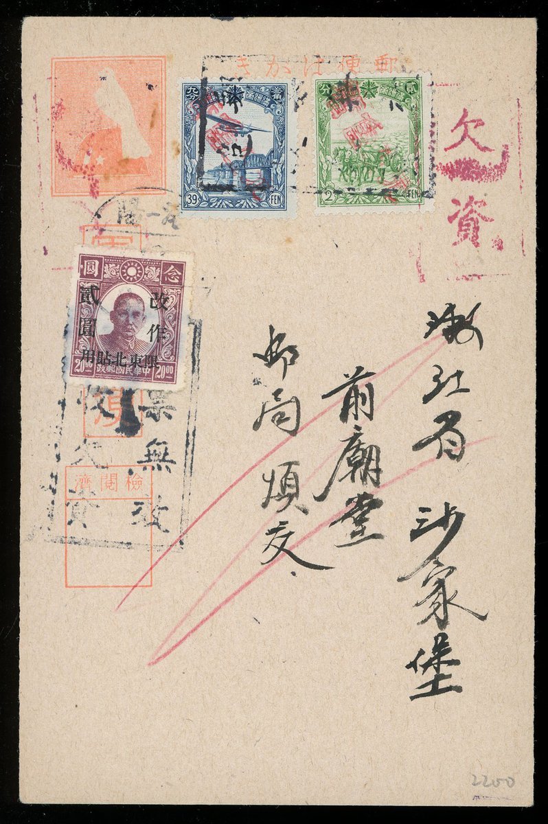 1948 Japanese military postcard to Chekiang, bearing two surch. on Manchukuo stamps, but declared void and with two boxed handstamp in black, so affixed NE surch. Dr. Sun $2 on $20. A boxed "Postage Due" in red on right top of postcard. 1952 (8 Apr.) Dalian to Zhangjikou Insurance cover, on the reverse bearing Northeast used Tien An Men $5,000 and $2,000 each, with 4th print Tien An Men $800 tied by Dalian bilingual c.d.s., Zhangjikou arrival c.d.s. (12.4) on address side. 1955 (5 Mar.) Shenyang to Shanghai cover, bearing combination franking with NE Tien An Men $800 and 1953 R7 $1,000 tied by Shenyang c.d.s., on the reverse with faint Shanghai arrival c.d.s., scarce for this combination.