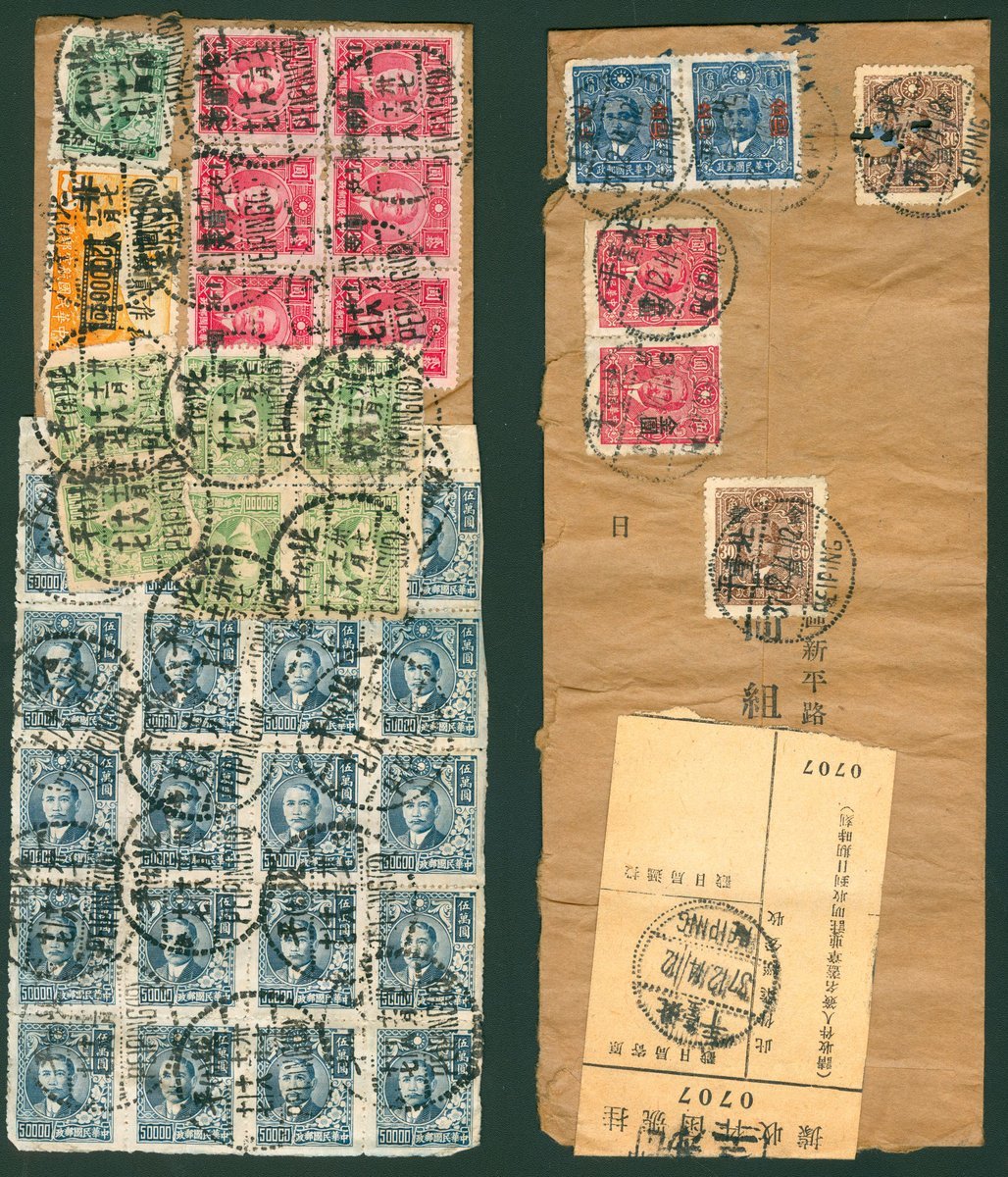 1948年北平誠記郵票社寄香港航空封2件:1,11月18日貼孫像國幣32枚,航空長框改國幣1枚,孫像加蓋金元半分1枚,1分6枚,國幣郵票總面值282萬,金元郵票總面值6.5分,銷北平11月18日戳;2,12月14日貼孫像加蓋金元6枚,總郵資金元2.1元,銷北京日戳,背另貼掛號條,整體保存完好