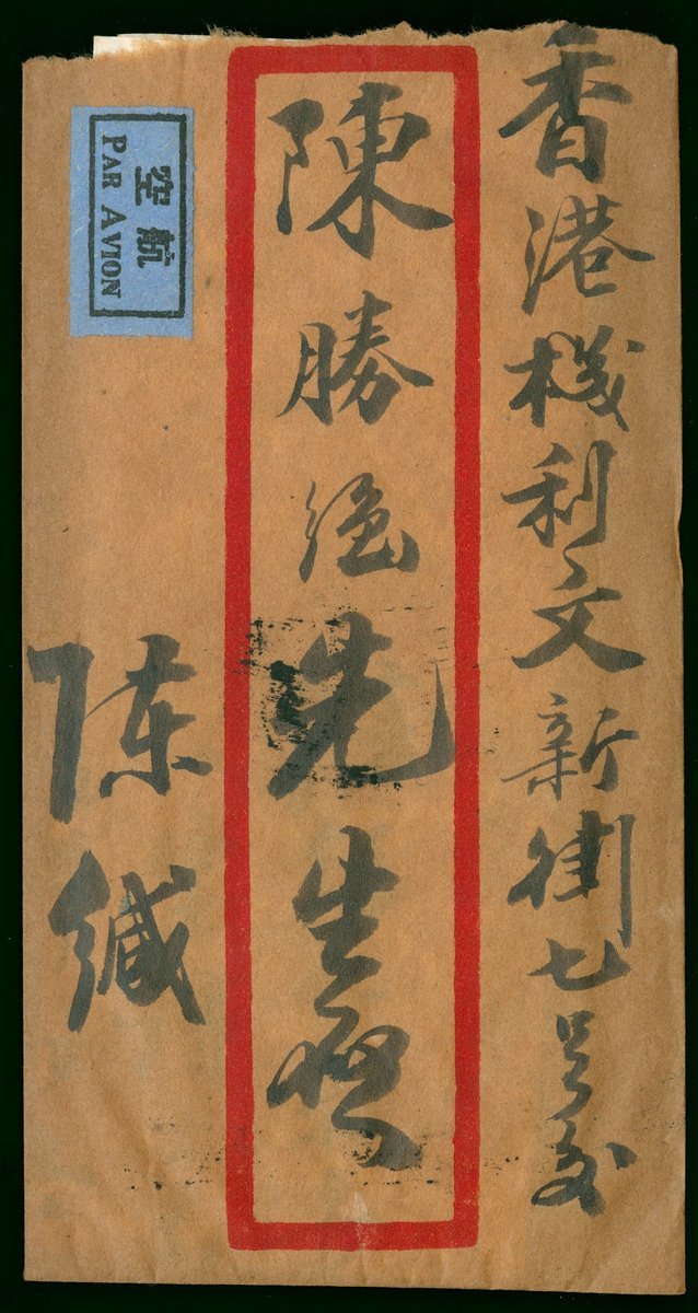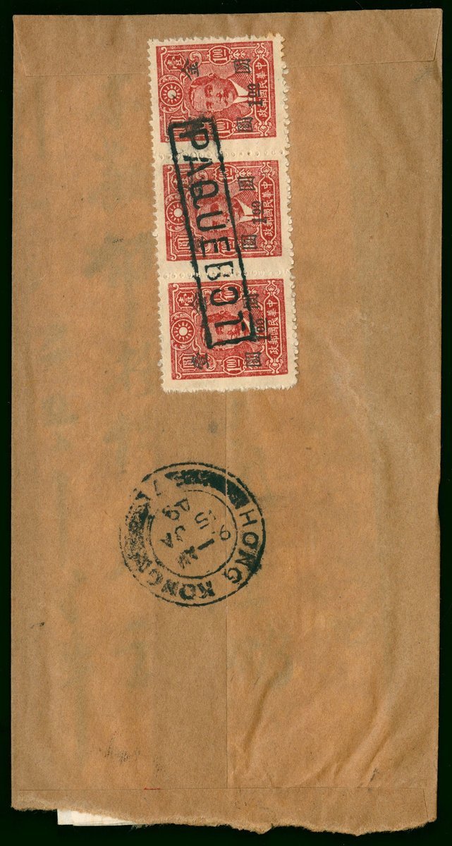 1949 (13 Jan.) from Canton to Hong Kong red-band cover, on the reverse with Dr. Sun gold yuan $1 horizontal strip of three, tied by boxed "PAQUEBOT" seal. Hong KOng arrival c.d.s. (15.1) alongside.