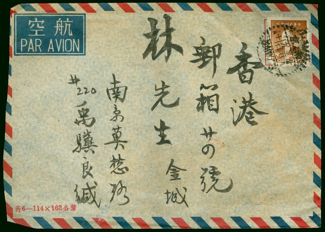 1949年南京寄香港航空封1件,貼大東版孫像金元孫像金元100元1枚,稅改金元1元2枚,3元1枚,合資105元,銷南京3月6日戳,此郵資僅使用15天,保存完好