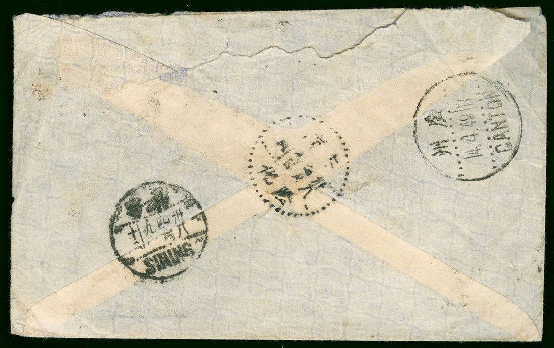1949年青海隆化寄紐西蘭航空封1件,貼孫像加蓋金元100元2枚,包裹印製加蓋金元1000元3枚,銷青海隆化4月7日戳,經西寧,廣州中轉,有西寧9日戳及廣州14日戳,郵路清晰,保存完好