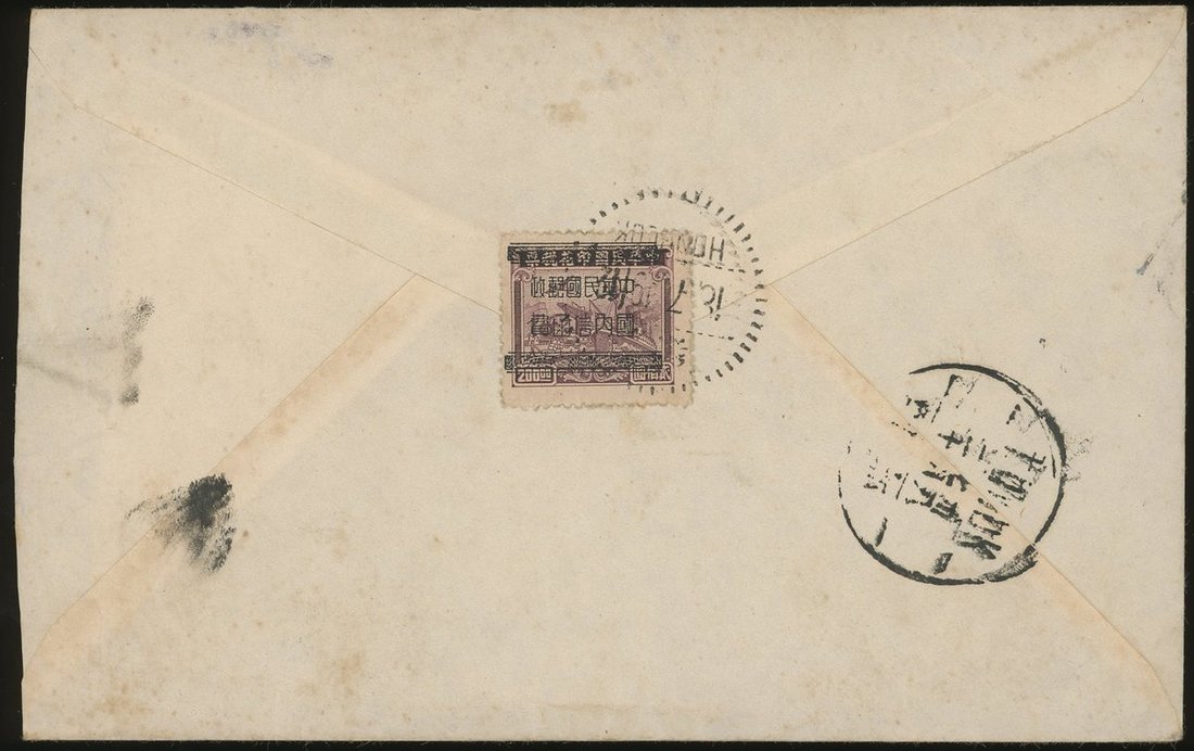 1949 (18 July) to Tohuk cover, on the reverse, bearing Canton overprint Unit Stamp $200, tied by Honglok c.d.s., Tohuk arrival c.d.s. (18.7) alongside.