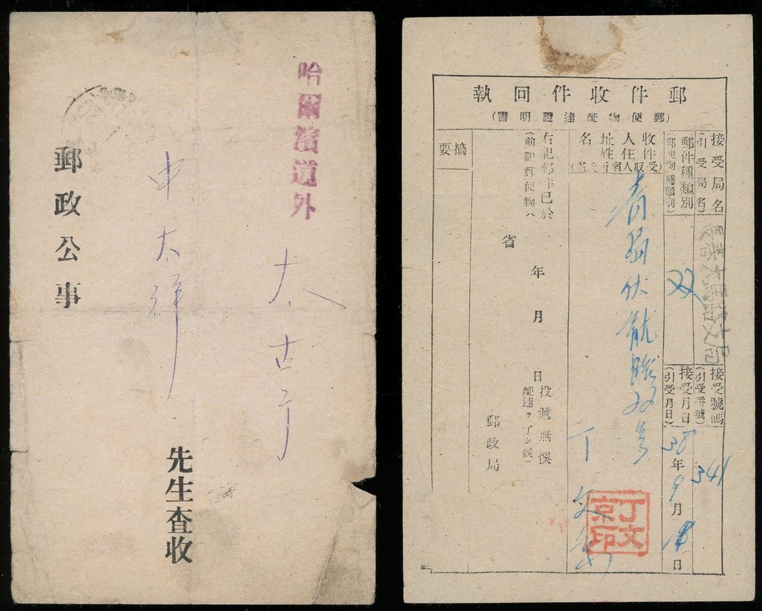 1949 (18 Sept.) Changchun to Tsingtao postal receipt with Tsingtao arrival c.d.s. (24.9), also 1939 (20 Jan.) postal receipt from Harbin to Hung Dao Ho Tze, with arrival c.d.s. (22.1).