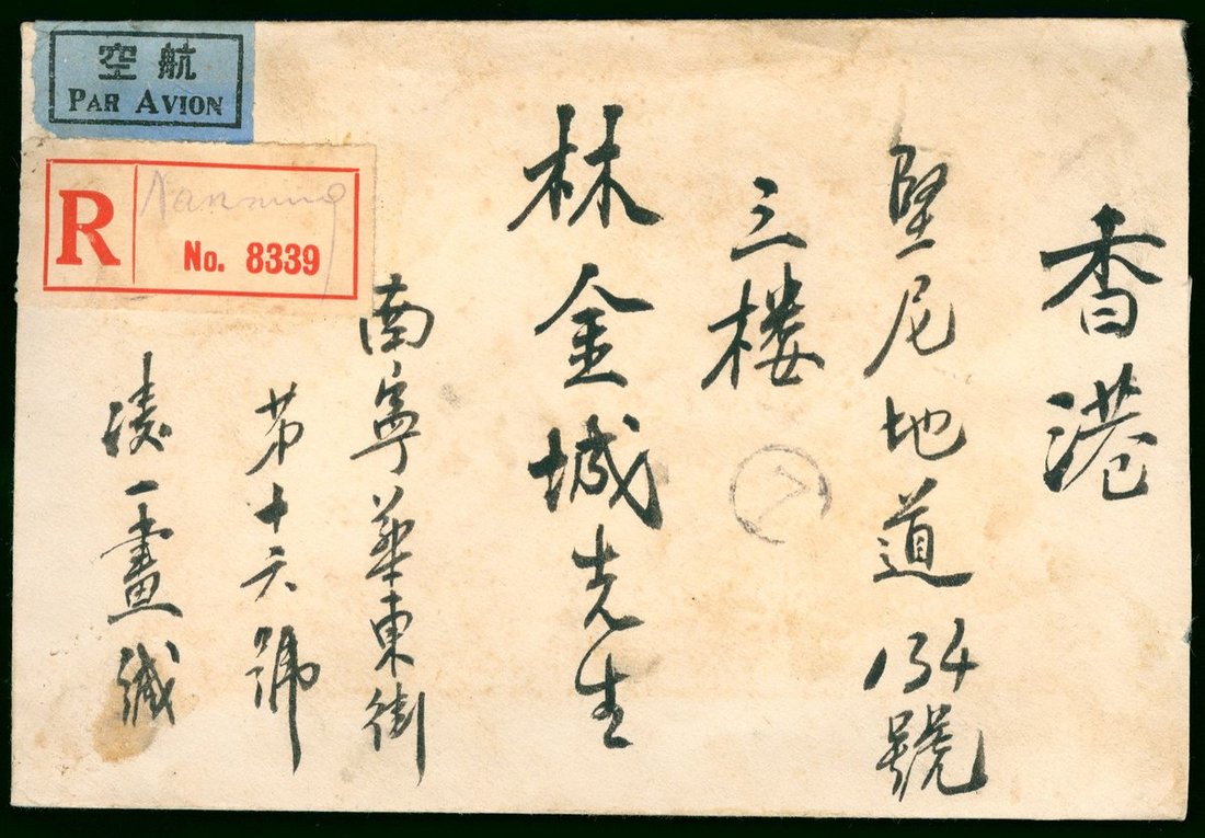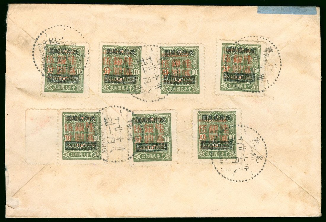 1949年10月21日邕寧(南寧)寄香港航空掛號封, 封背貼永寧第一次加蓋貳萬圓再加蓋紅色"桂區銀圓伍分"票七枚, 銷邕寧雙語日戳, 信封面貼有航空及號碼8339的掛號簽紙. 銀圓掛號封寄香港少見.