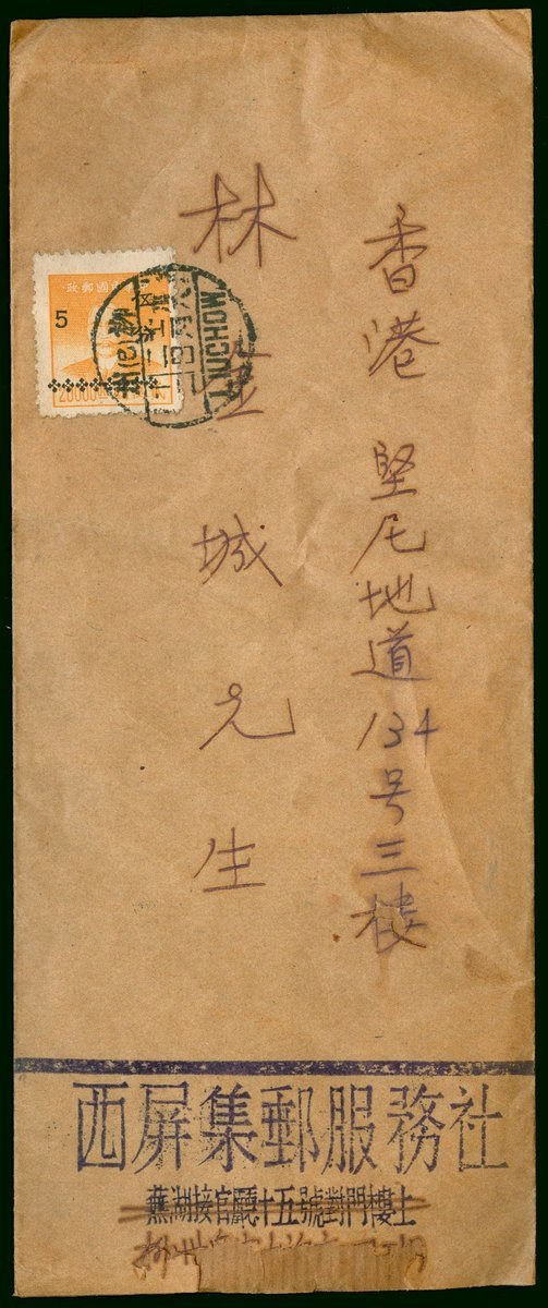 1949 (2 Dec.) envelope to Hong Kong bearing East Szechwan surcharge 5c. on $20,000 cancelled by Liuchow bilingual c.d.s., with content (worn hole / insect damage), nevertheless nice cover. Chan S37