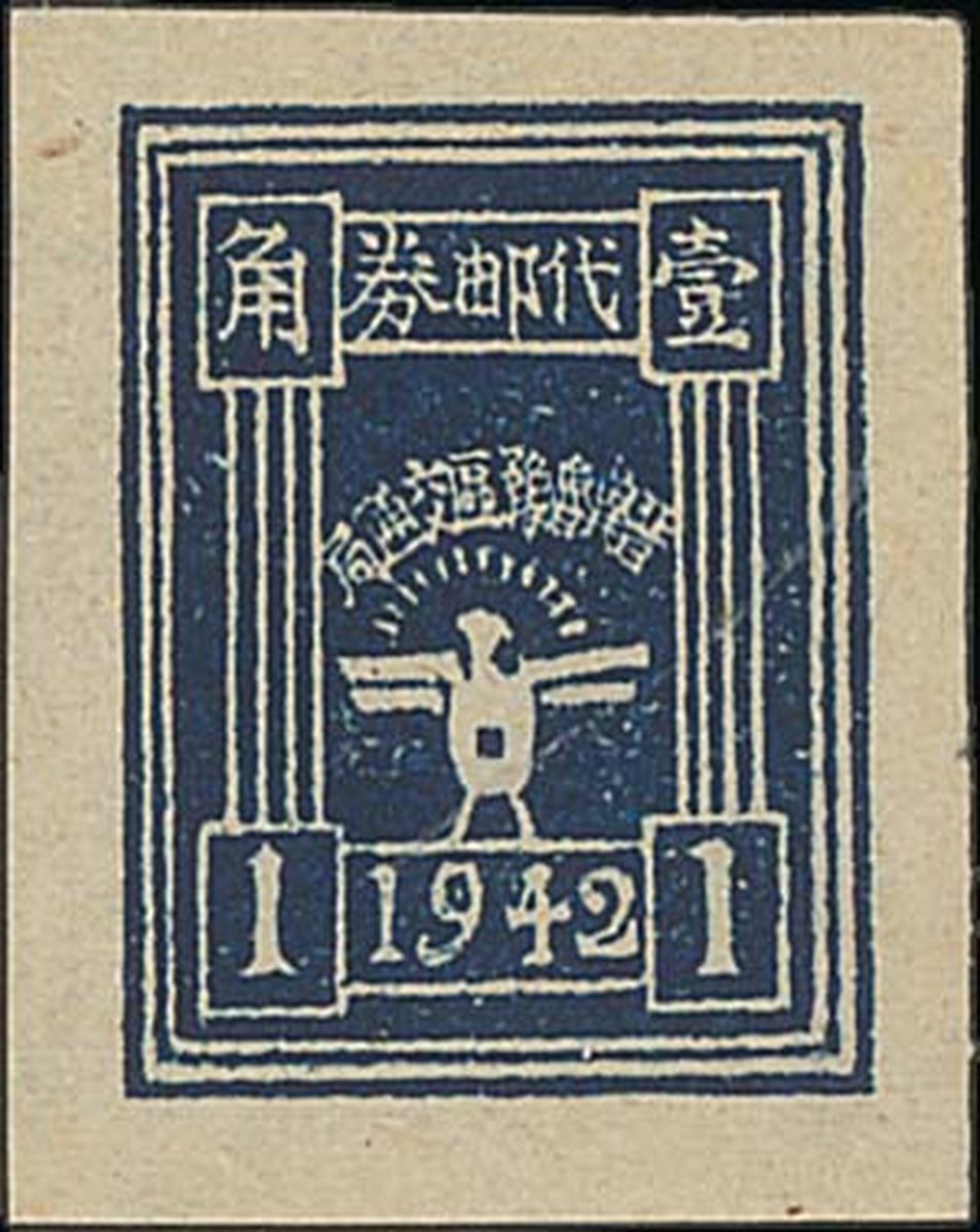 1942年晉冀魯豫邊區代郵票劵: 一角,藍色,新票,邊紙寬闊,顏色鮮豔,品相良好。楊目NC162; S.G.69