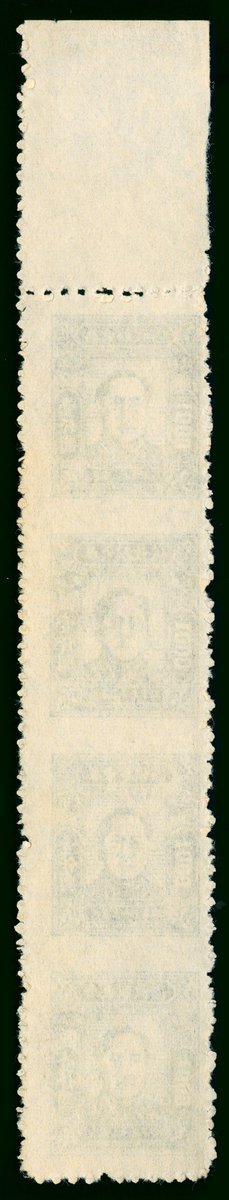 1948年華東解放區第一版毛像1000元有齒新票直四連1件,帶上邊紙,橫向齒孔均漏齒變體,上中品