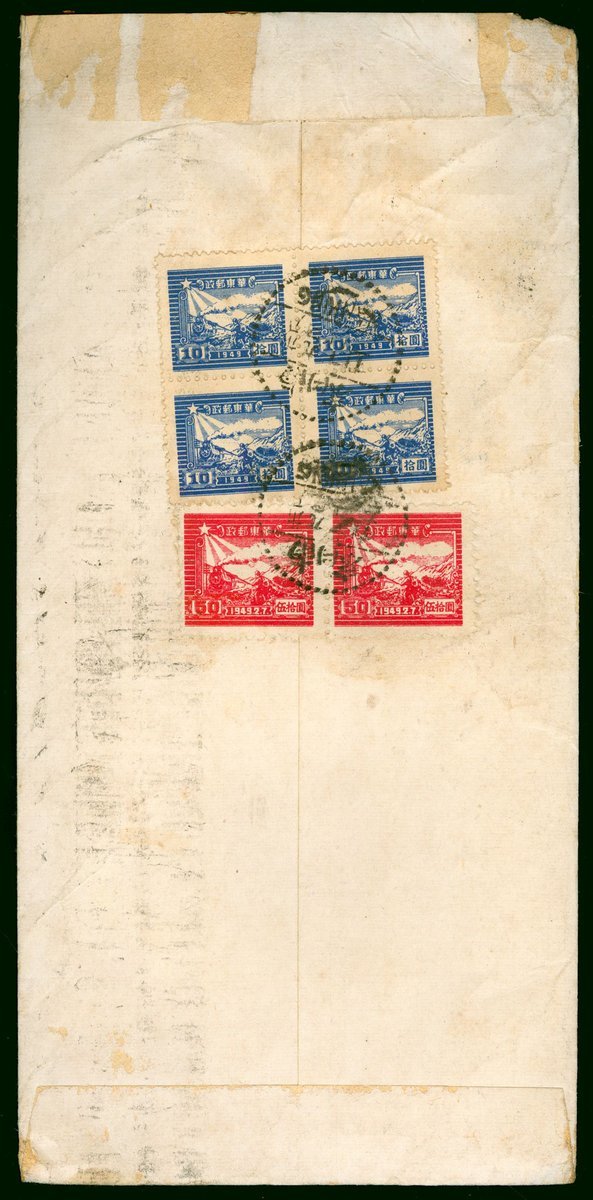 1949 (10 Sep.) East China, a cover to Hong Kong bearing $10 (4) and $50 tied by Nanking c.d.s., on front with Shanghai (11.9) meter transit cancelled.