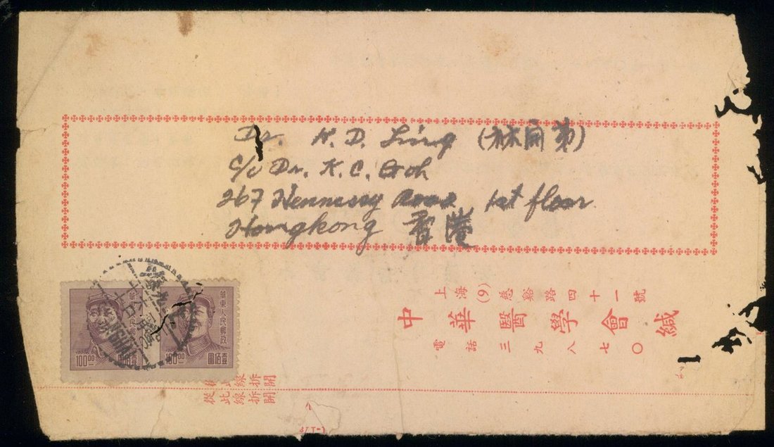 1950年上海中華醫學會寄香港會費繳納通知單1件,貼華東區三一版毛像100元2枚,銷上海1月6日戳,保存完整,此封為當時寄香港(同國際)印刷品郵資,較少見