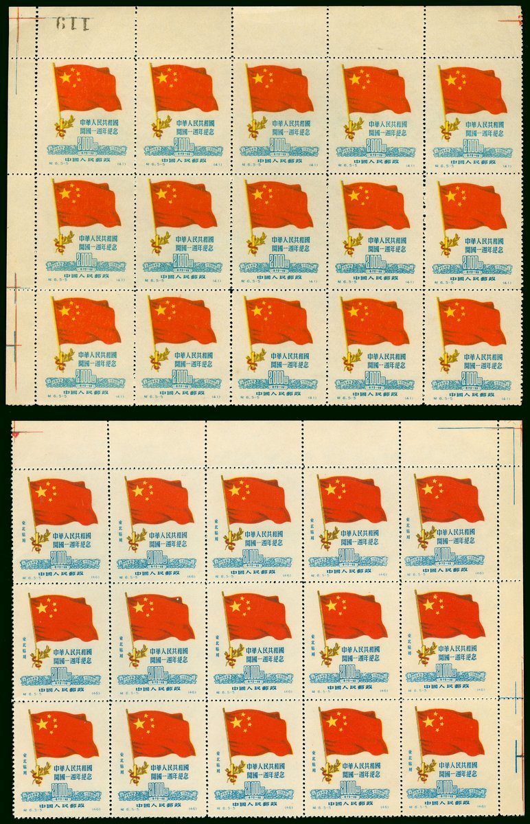 1950年紀6及紀東6開國一周年紀念再版新票15枚方連各一套,其中小幅票均帶右上直角邊紙,大幅票為帶左右及上邊紙十方連,以及其它位置連票,整體票面顏色鮮豔,齒孔完整,上中品